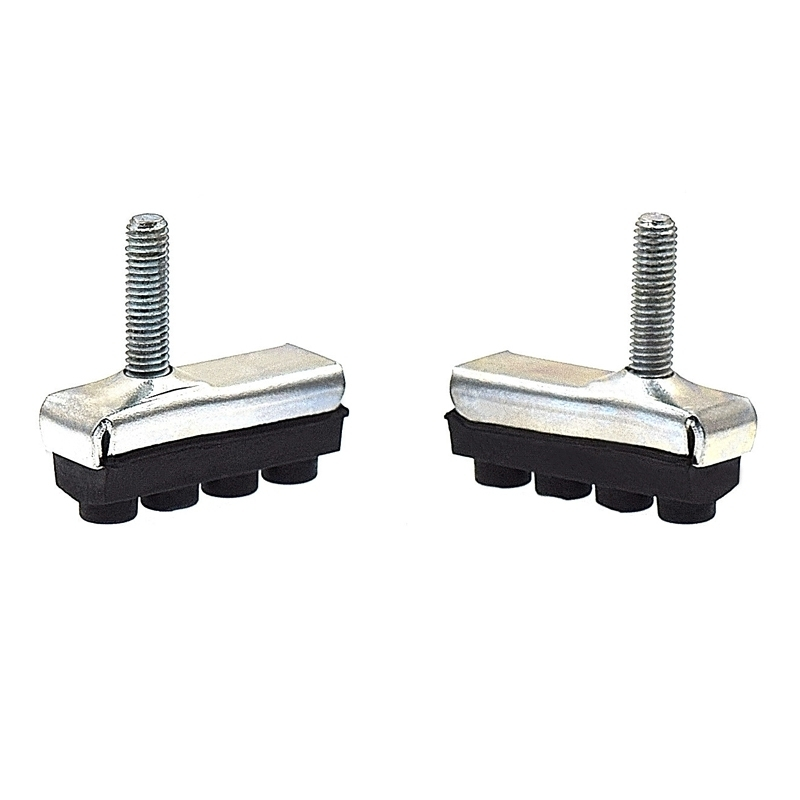 Cette paire de patins prémontés sur base en acier galvanisé avec tige filetée de 6 mm offrent la possibilité de remplacer facilement les patins d’origine en cas d’usure, craquelures des caoutchoucs ou détérioration du support causé par la rouille.