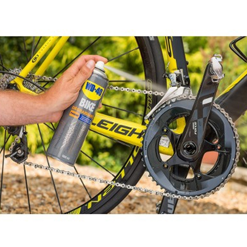 Le dégraissant puissant de WD-40 facilite rapidement le nettoyage des composants du vélo afin de bien assurer leur lubrification et prévenir l’usure des pièces.