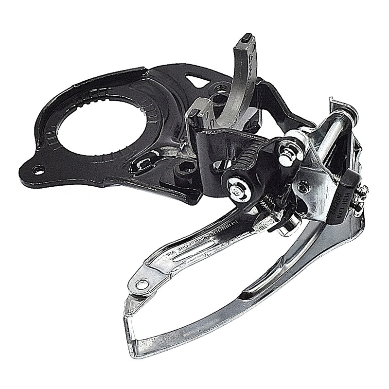 Le dérailleur pour VTT Shimano Altus type E convient aux pédaliers avant triples ou doubles, il se fixe au moyen de sa patte en acier au niveau du pédalier du vélo.
