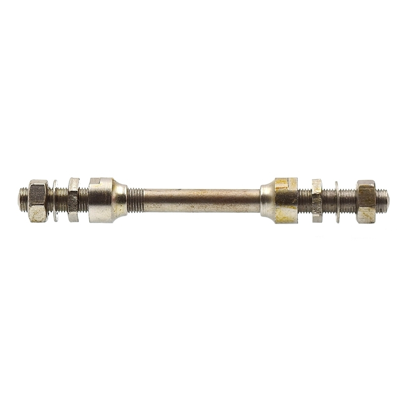 Cet axe en acier argenté de 125 mm permet de fixer la roue avant du vélo.