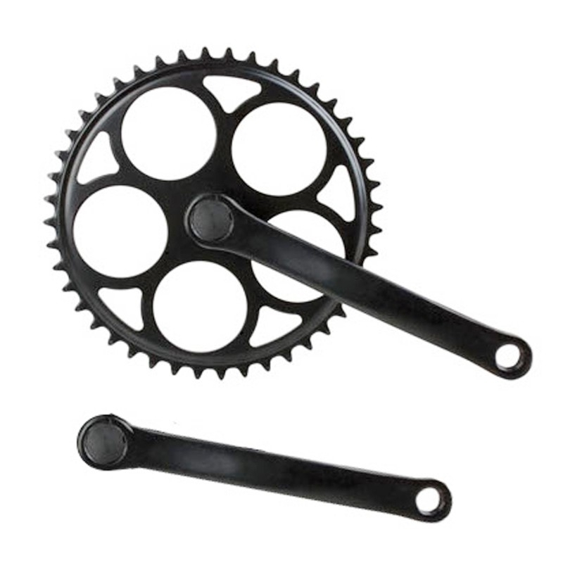 Ce pédalier en acier de couleur noir permet de donner un style vintage à votre vélo ou tout simplement rénover la transmission d’un vélo mono vitesse à pignon libre ou pignon fixe.