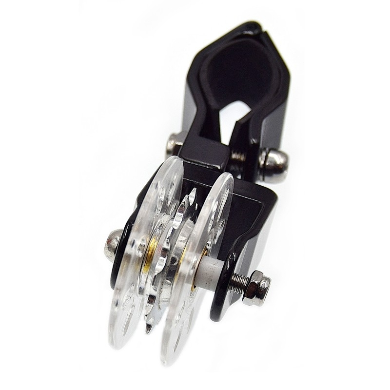 Sa base pivotante à 360 ° et sa mâchoire de fixation avec bande en caoutchouc rendent cette roulette guide chaîne compatible avec un grand nombres de vélos tel que vtt, vtx, vélo urbain, tandem, vélo couché, tricycle et vélos en auto construction.
